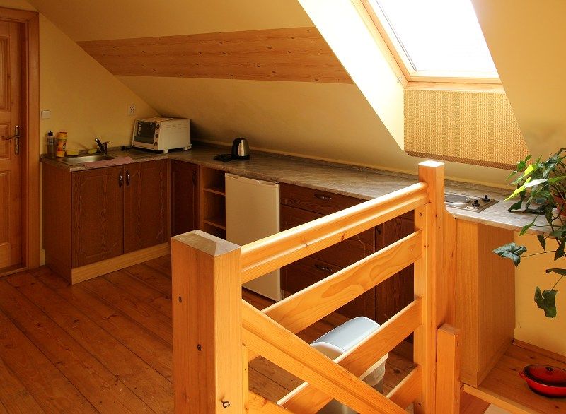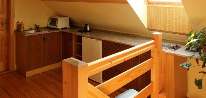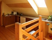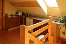 Součástí objektů není restaurace. Hosté se stravují sami v plně vybavené kuchyni v obou objektech.