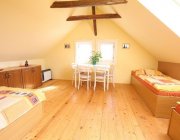 Zde jsou k dispozici 2 ložnice (1x dvoulůžkový pokoj a 1x čtyřlůžkový pokoj). I zde je sociální zařízení s toaletou a sprchovým koutem (bojler 120l). I vybavení kuchyni je stejné jako v prvním objektu, jen zde se nachází pouze jedna lednice. Vytápění je možné el. přímotopy.
