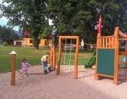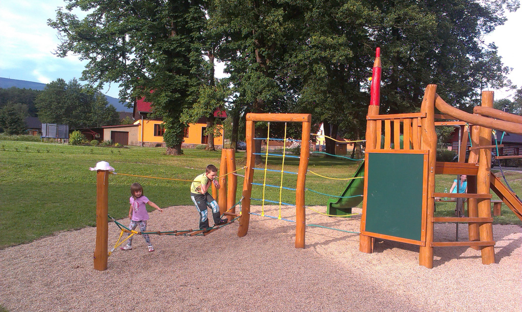 houpačka, dětské hřiště, pískoviště, prolézačky, skluzavka.