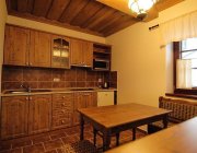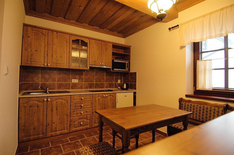 Kuchyňský kout obsahuje základní vybavení, lednici, sklokeramickou varnou desku, odsavač par, mikrovlnnou troubu, rychlovarnou konvici a topinkovač.