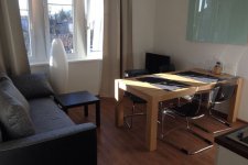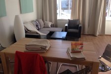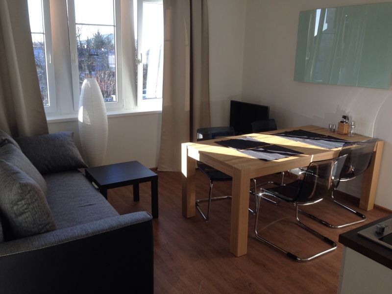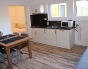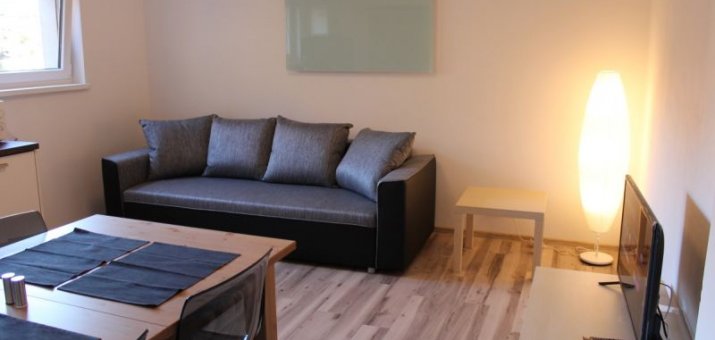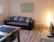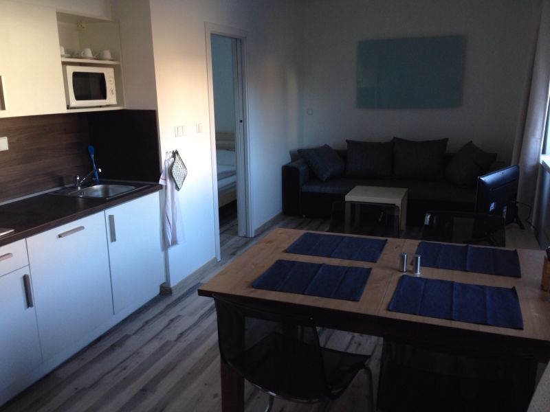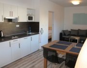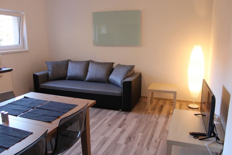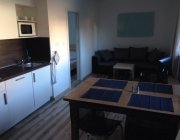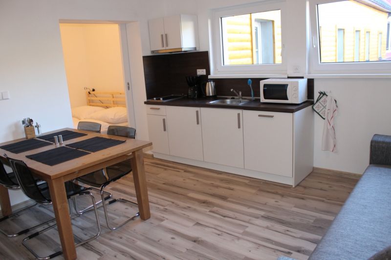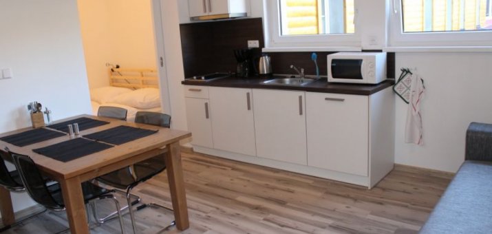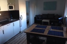 Obývací pokoj se satelitním televizorem. Součástí obývacího pokoje je také kuchyňský kout. Zde je k dispozici lednice, sklokeramická deska, rychlovarná konvice, kávovar, myčka nádobí a dostatečné množství nádobí.