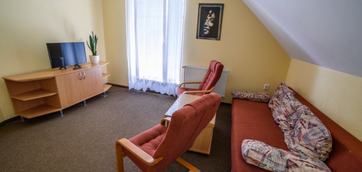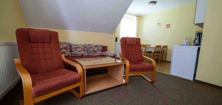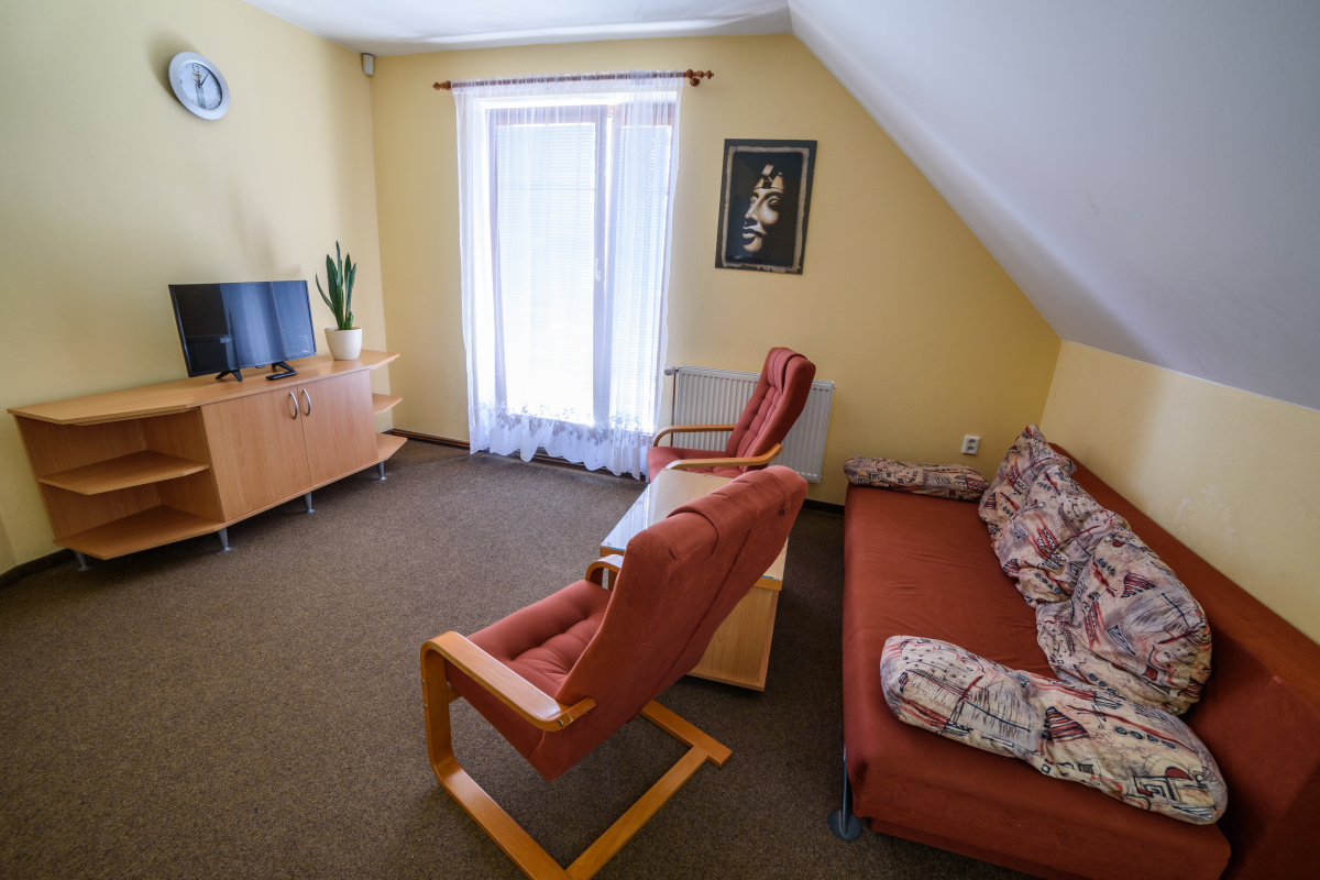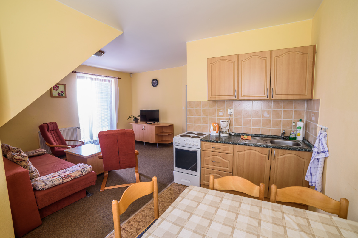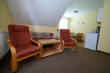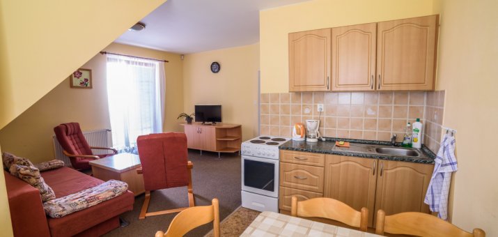 Po rozložení sedací soupravy a válendy v ložnici je celková kapacita apartmánu až 6 osob.