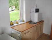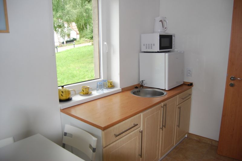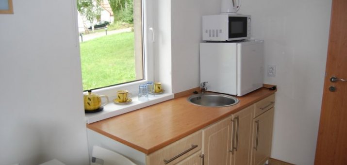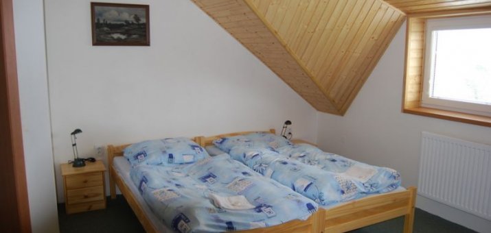 Hostům je k dispozici 8 dvou a třílůžkových pokoju a dva pokoje s minikuchyňkou (s příplatkem 70,- Kč na den). Všechny pokoje jsou vybaveny sociálním zařízením a TV. Většina pokojů má výhled na jezero.