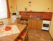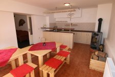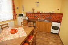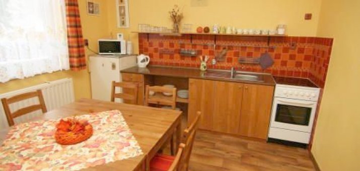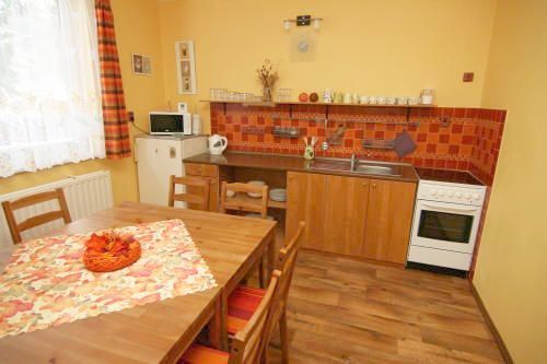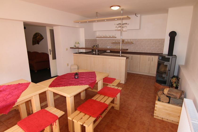V penzionu je společná, plně vybavená kuchyně (mikrovlnná trouba, rychlovarná konvice, sporák, lednice, talíře, hrnce, příbory), 3x sociální zařízení ( 2 x sprchový kout, WC, umyvadlo), společenská místnost s krbovými kamny , TV, hry, knihy.