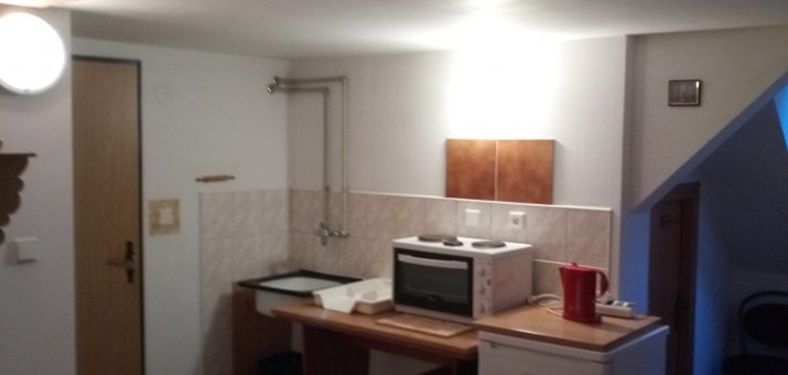 - Aartmán č. 2: V přízemí, 1 x obytná kuchyň, 1 x pokoj, plynový vařič, pec, sprcha, WC, mikrovlnka. TV
